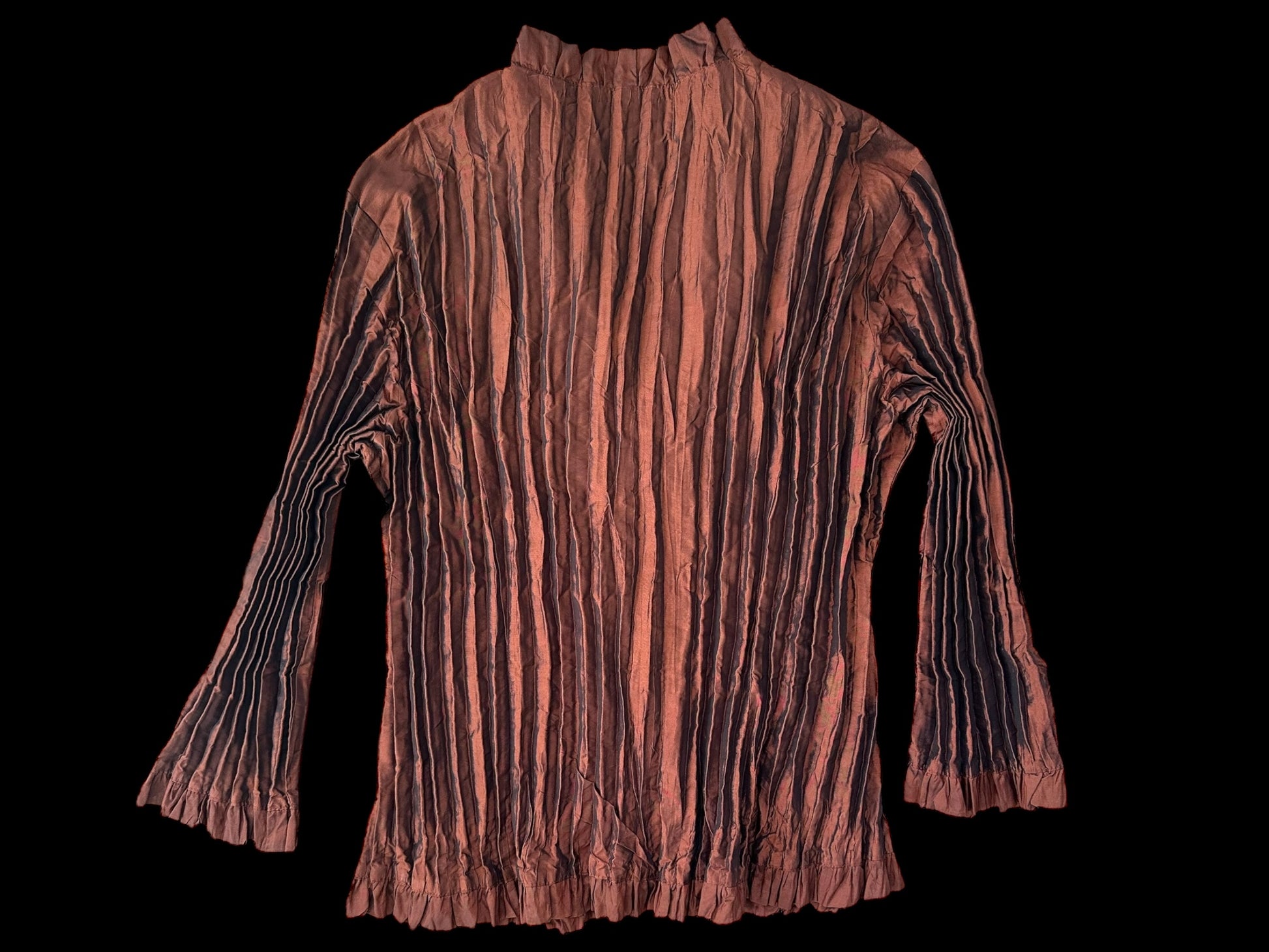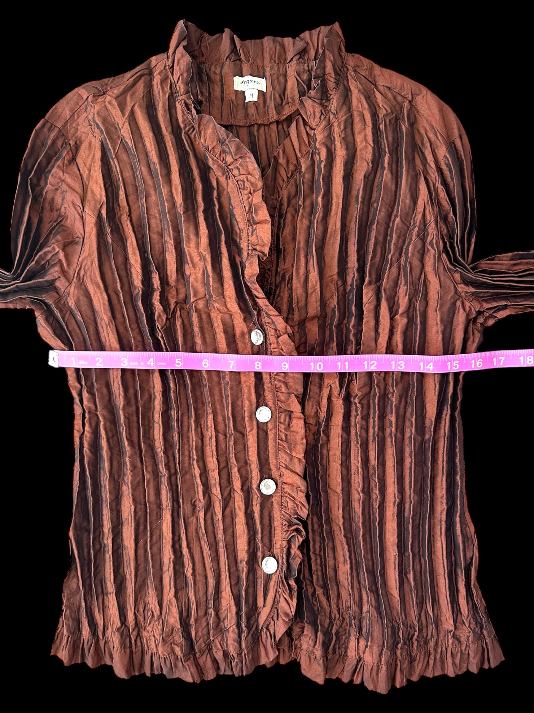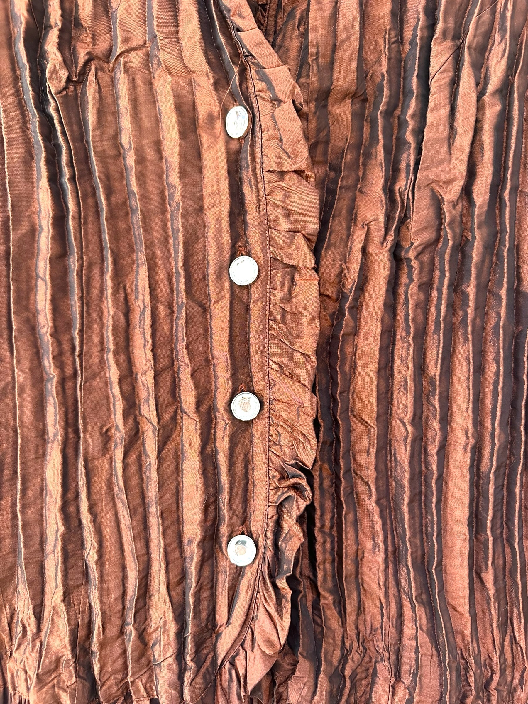 Elevate your style with our Burgundy Pleated Blouse. The 3/4th length sleeves add elegance while the large rhinestone buttons provide a touch of glamour. Made with high-quality materials, this blouse is perfect for any occasion. Stand out in this unique and stylish piece.