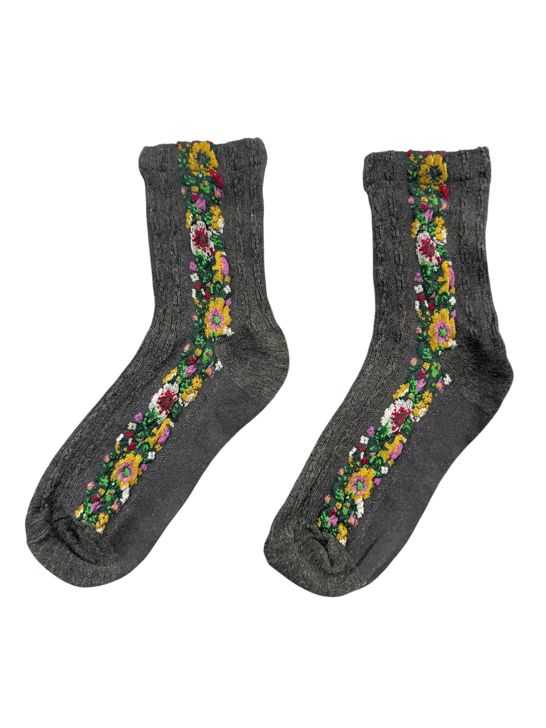 Elevate your sock collection with these embroidered crew socks in a versatile grey hue. Featuring a detailed multicolored floral pattern in yellow, green, red, and pink, they combine style with subtle sophistication. Crafted for comfort and durability, these socks bring a refined touch to everyday outfits while ensuring a secure fit throughout the day.