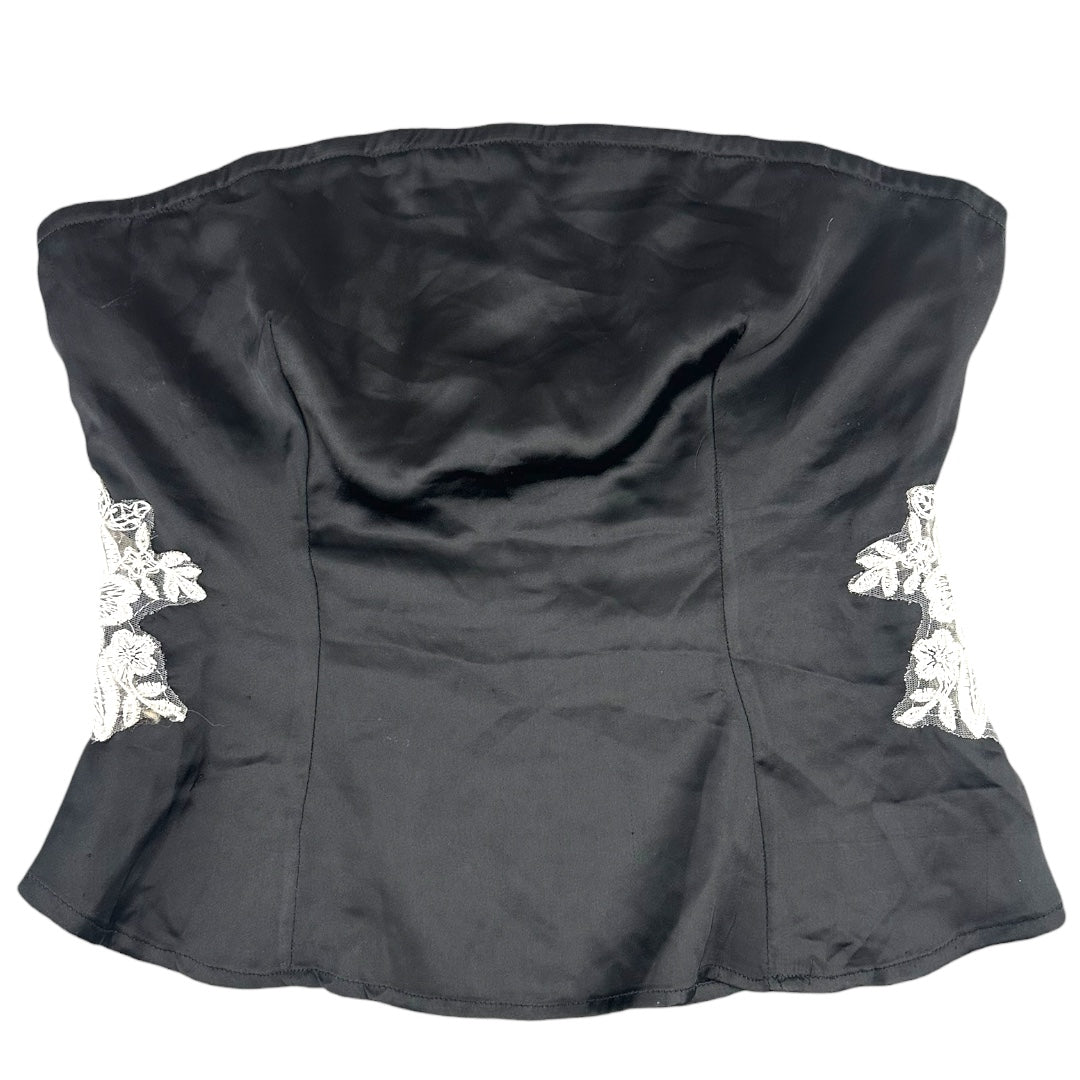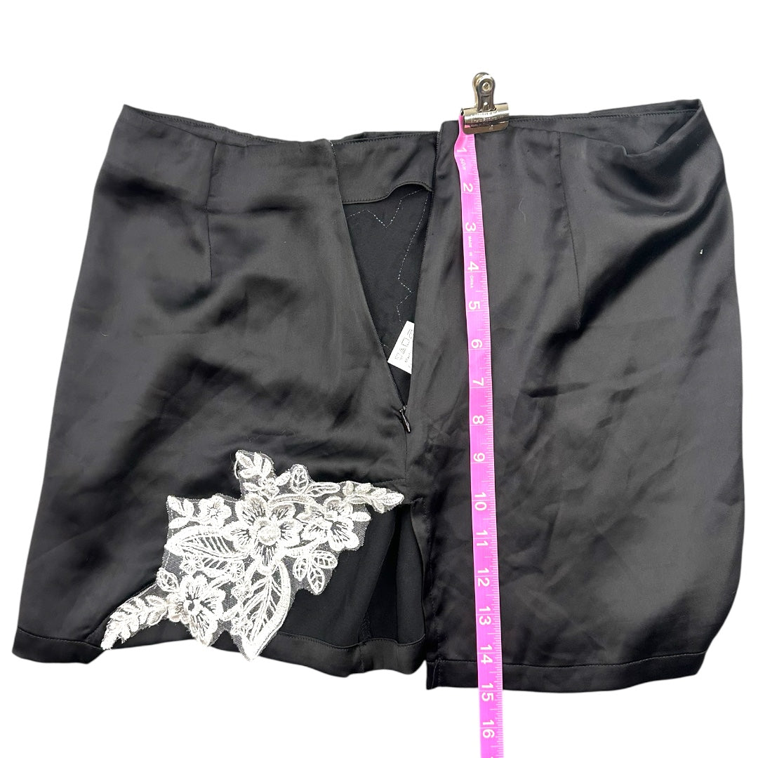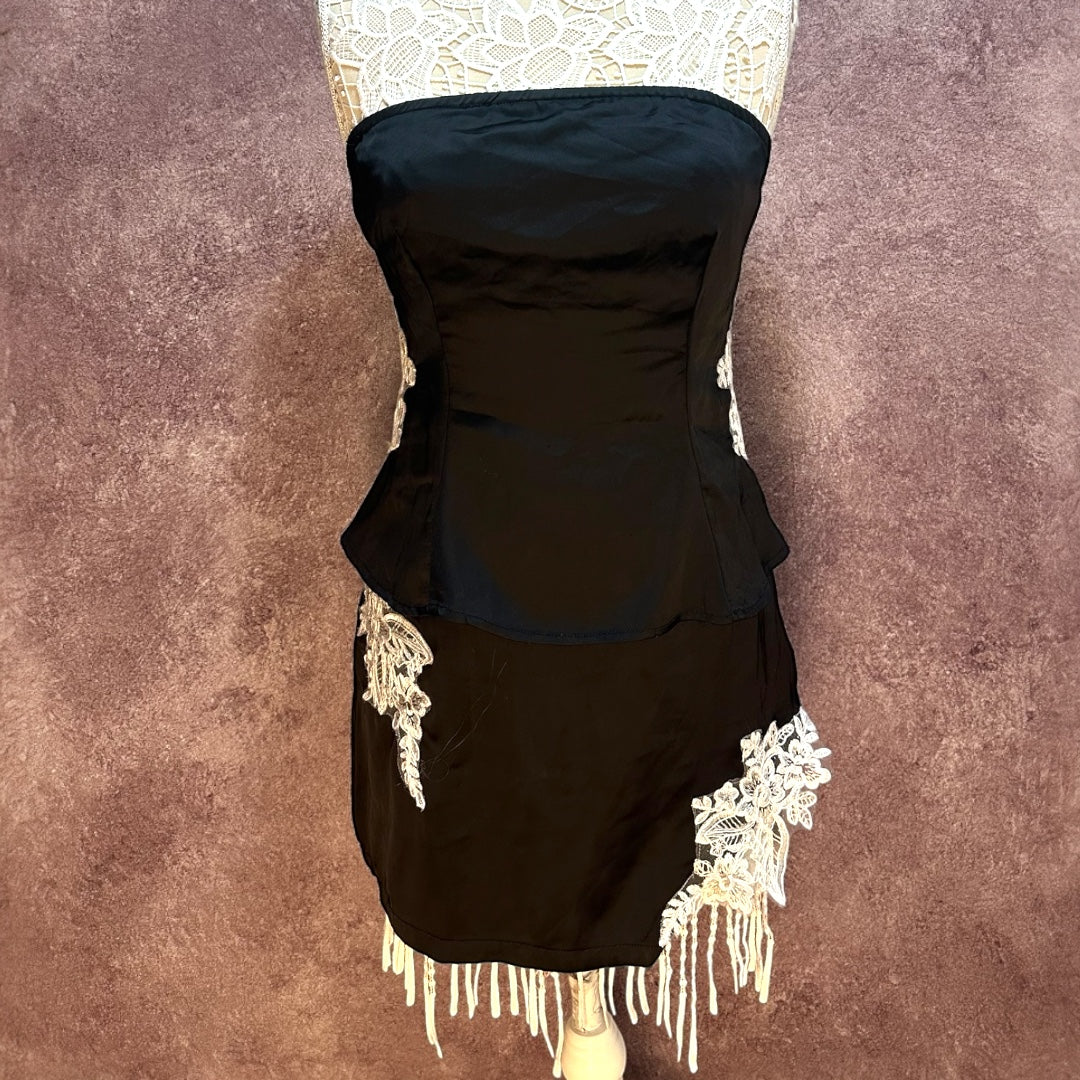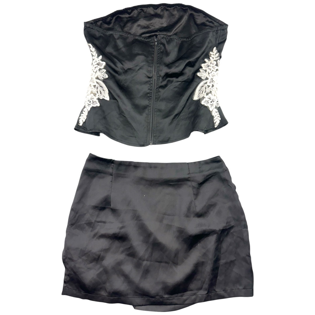 Princess Polly Sittella two piece set in sleek black satin with stunning white floral lace appliqués. The strapless tube top features structured boning and a side or back zipper for a polished silhouette, while the high waisted mini skirt showcases matching embroidery for a coordinated look. Perfect for making a statement at special occasions or nights out. The combination of luxe fabric and intricate detailing creates an effortlessly elegant ensemble.