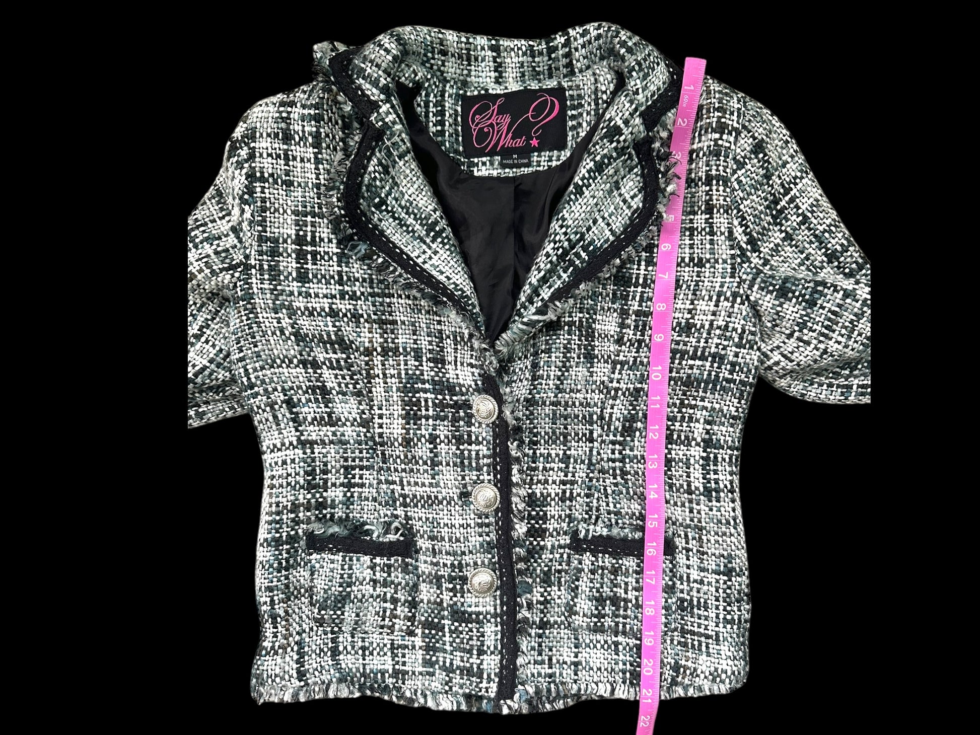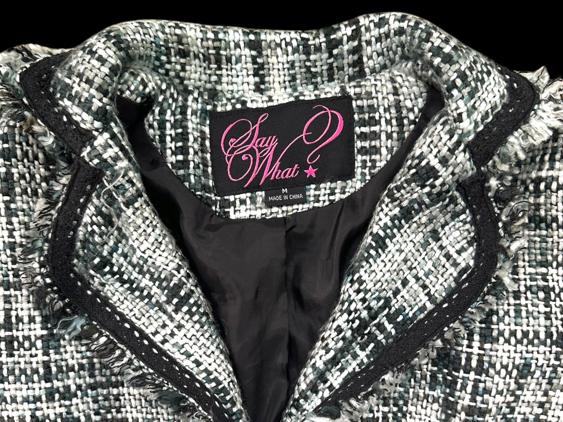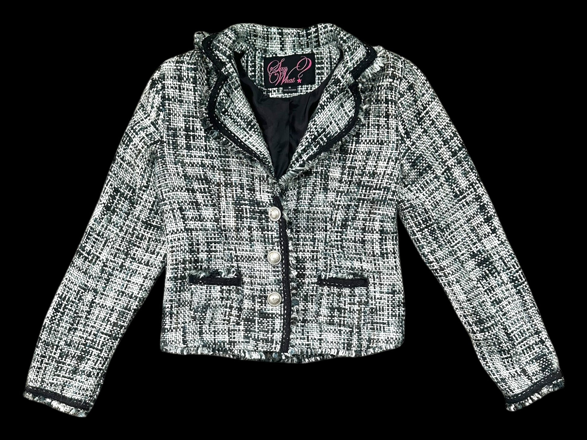 Elevate your wardrobe with the Say What? Black and White Tweed Blazer. This classic button-up blazer features long sleeves and distinctive fringe detailing on the collar, cuffs, and pockets, adding a refined touch to its timeless tweed pattern. Perfect for professional or smart-casual settings, it combines sophistication with subtle texture to enhance your look.