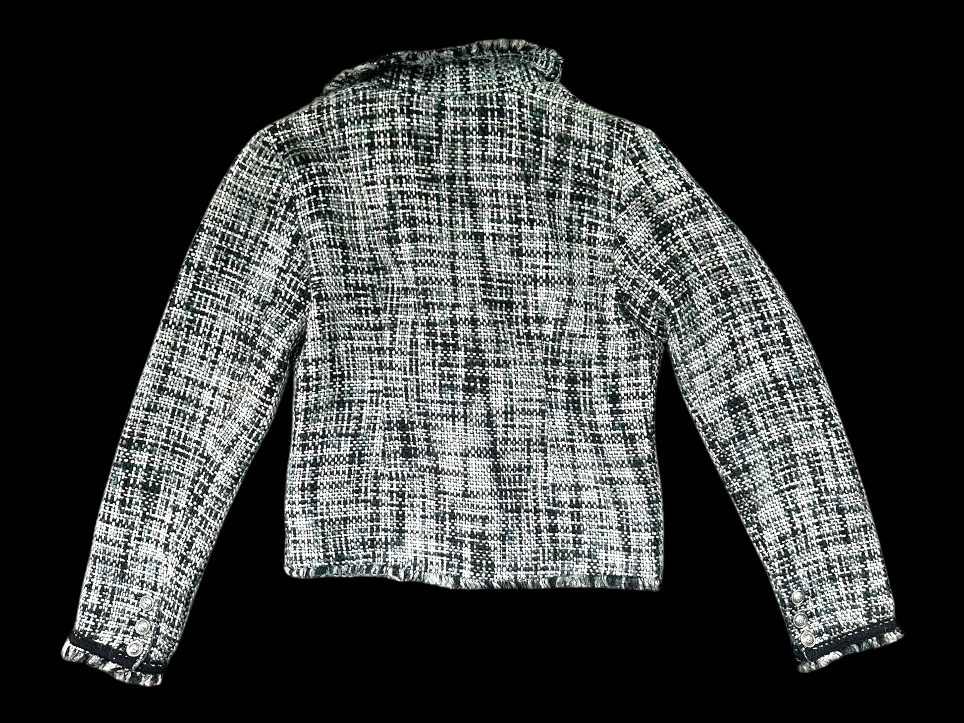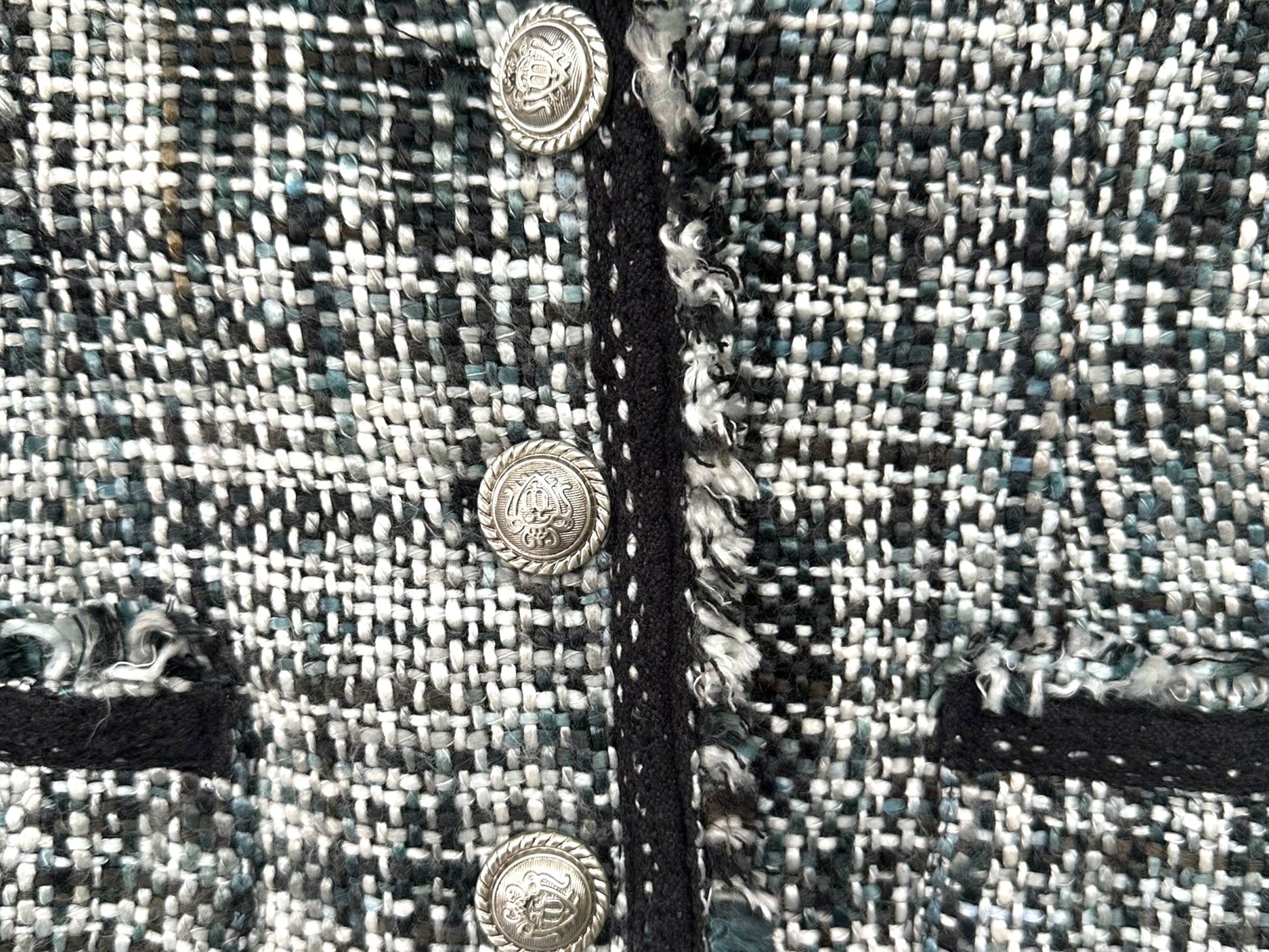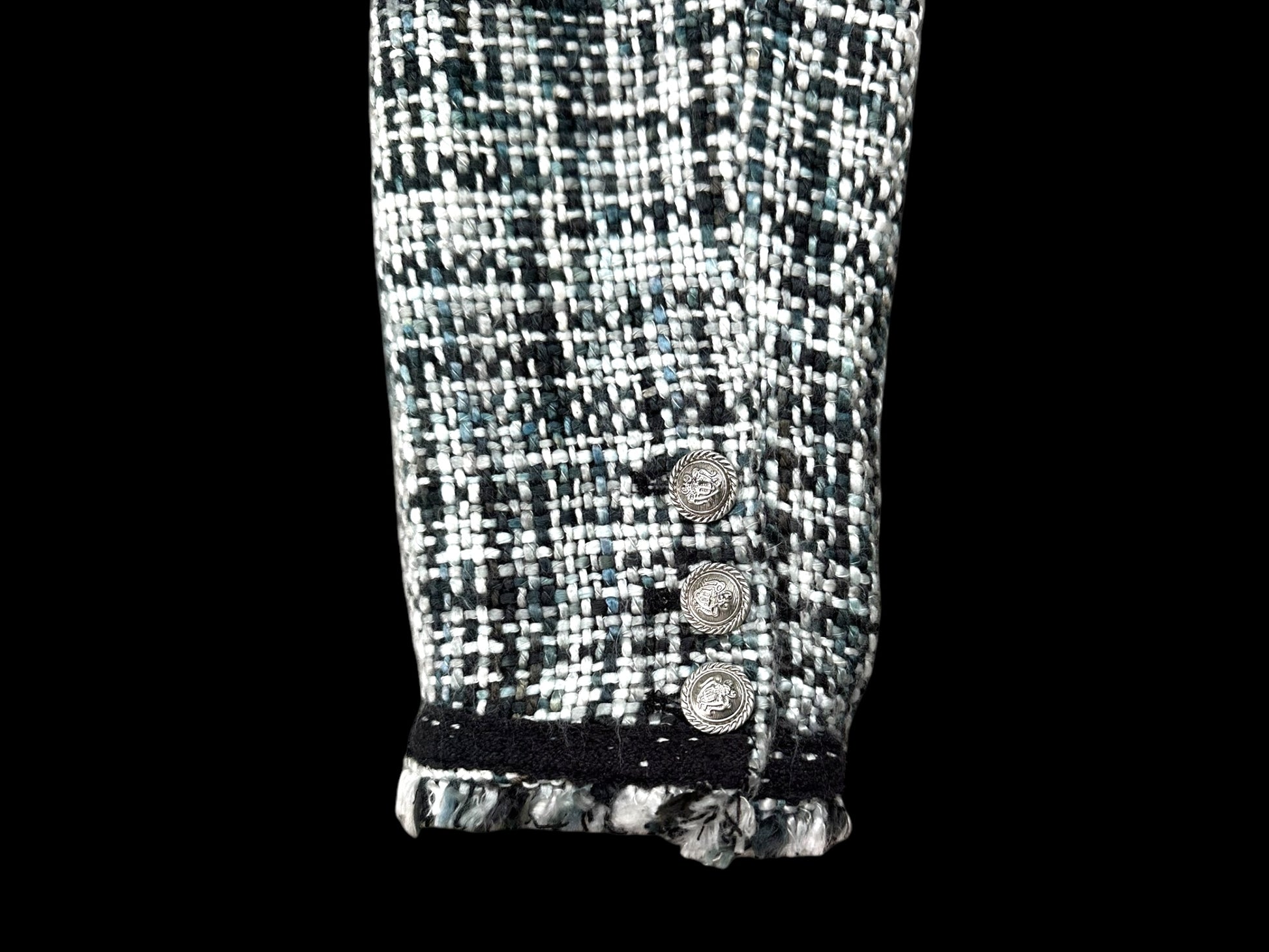 Elevate your wardrobe with the Say What? Black and White Tweed Blazer. This classic button-up blazer features long sleeves and distinctive fringe detailing on the collar, cuffs, and pockets, adding a refined touch to its timeless tweed pattern. Perfect for professional or smart-casual settings, it combines sophistication with subtle texture to enhance your look.