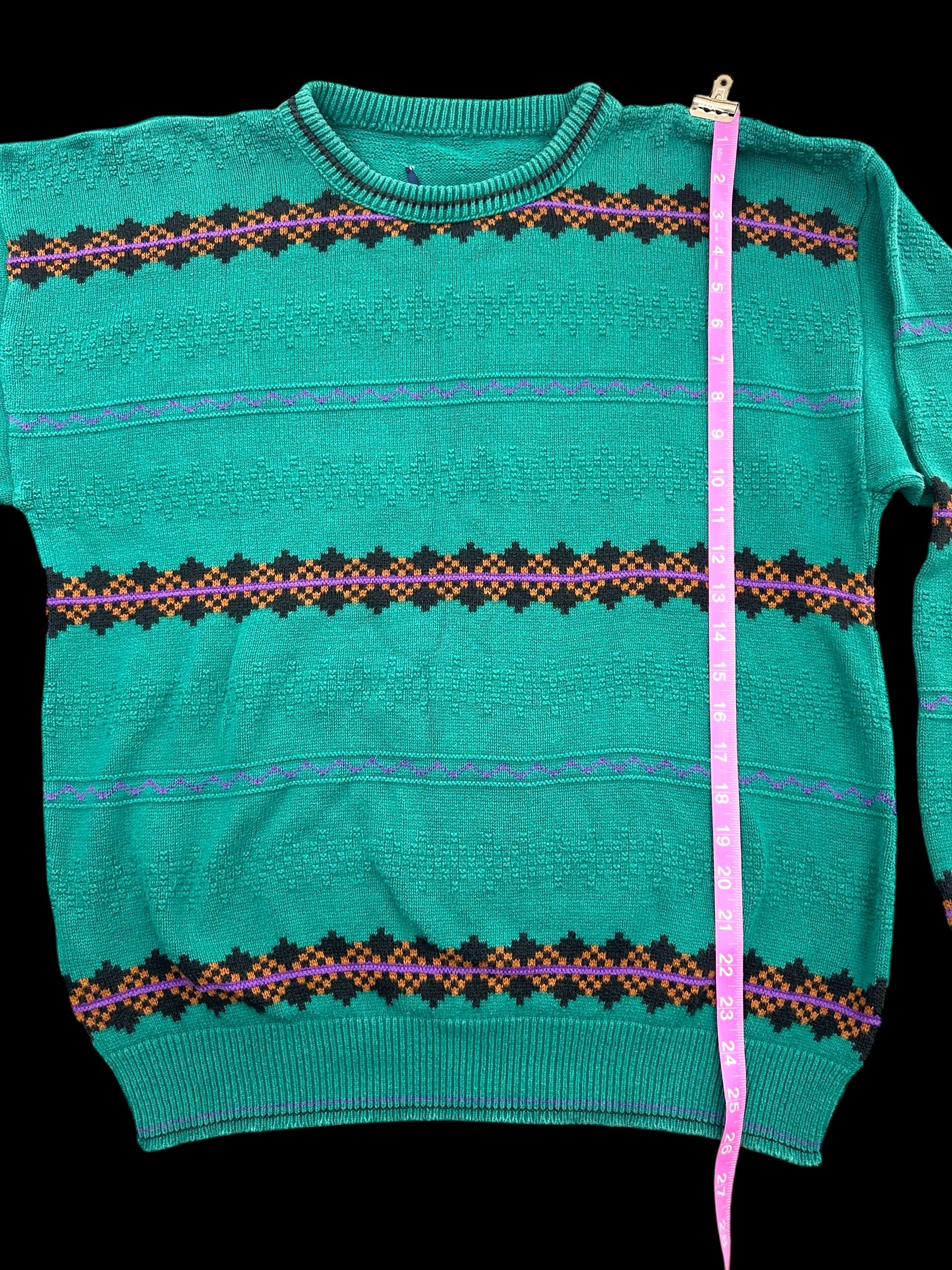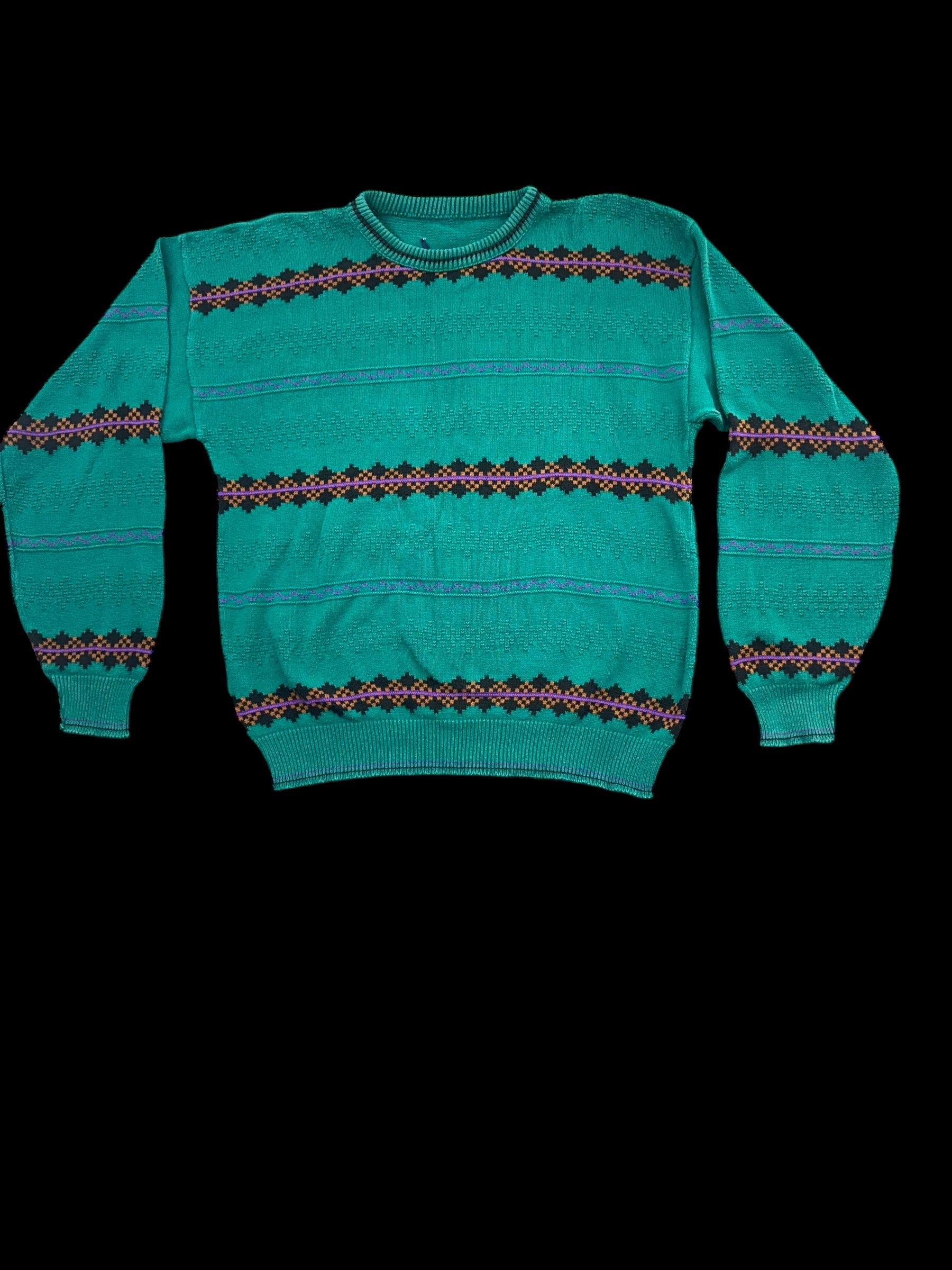 Step into retro style with this authentic vintage teal pullover from the 1980s-90s era. Featuring a vibrant teal base adorned with bold horizontal stripes in pink, red, blue, and black geometric patterns, this crewneck sweater captures the unmistakable aesthetic of its decade. The patterned bands across the chest, sleeves, and hem showcase the graphic design sensibility that defined the era. Crafted from a quality acrylic or wool blend, this oversized-fit piece delivers both warmth and nostalgic appeal. Perfect for vintage enthusiasts seeking authentic period pieces with character and color.